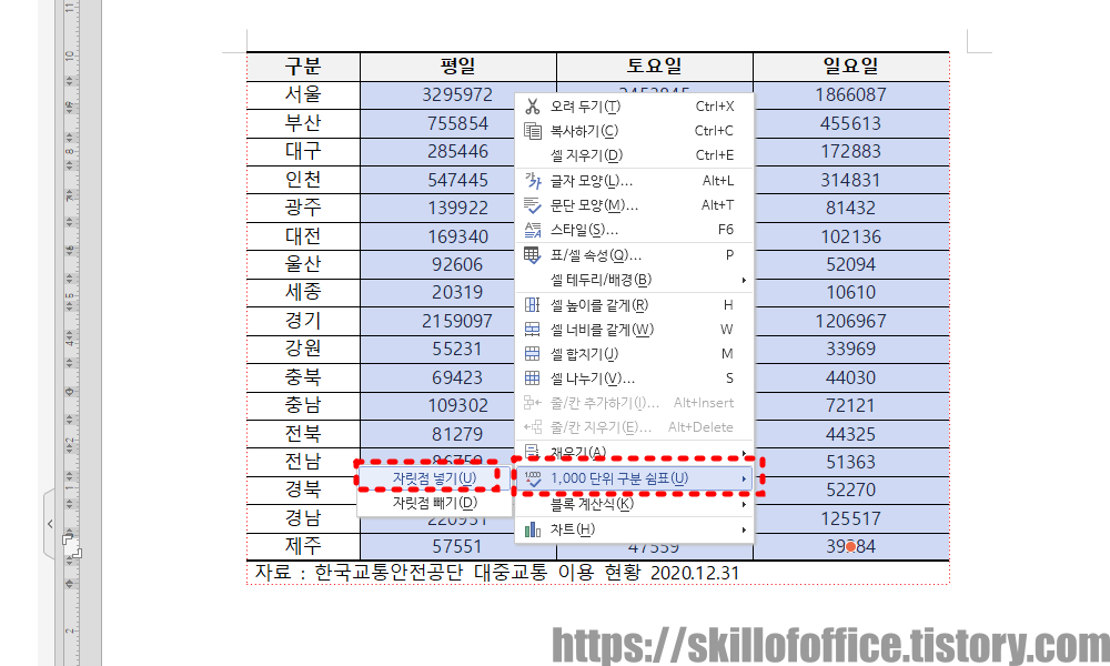 천 단위로 넣을 표를 드래그 → 드래그 된 표 셀 중 하나를 우클릭 → 1,000단위 구분 쉽표 선택 → 자릿점 넣기 선택